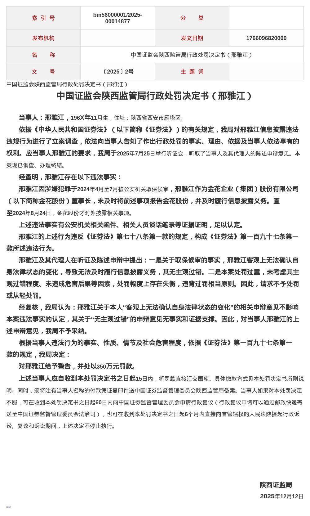 邢雅江的上述行为违反《证券法》的相关规定。陕西证监局决定对邢雅江给予警告,并处以350万元罚款。